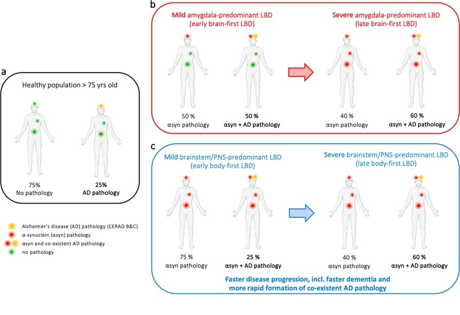 b 早期brain-first LBDではAD合併が多い.後期でさらに増加